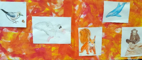 Exercices sur les matières: poils/plumes/peau/écaille et apprentissage du dessin naturaliste en expérimentant le dessin de silhouettes d’animaux avec les espaces négatifs.
