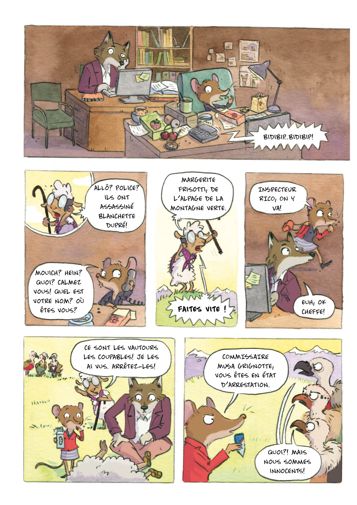 Musa et Rico, un duo de choc pour démêler le vrai du faux! Ce n’est pas parce qu’un animal a une « sale tête » qu’il a forcément commis un crime! Dans cette bande-dessinée pour les enfants, dès 6 ans, Musa Grignotte, la musaraigne commissaire et Rico Lupo, le loup inspecteur, démontent les préjugés sur ces animaux mal-aimés, qu’on ne trouve jamais dans les livres: les vautours, requins ou chauves-souris!